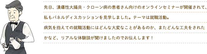 大学時代にヘルスケアに興味があって関連する活動をしていたが、その経歴をエントリーシートに書く時に、自分も患者であることを添えていた。ある程度症状がコントロールできているし、活動に制限があるわけではないので、「これだけ活動してきた」という伝え方をした。